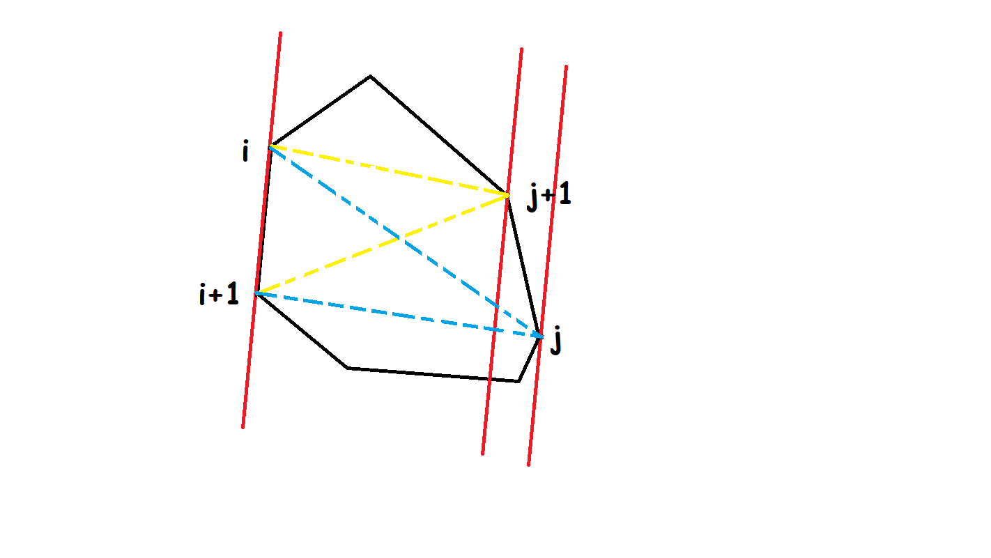 该算法比较常见的中文名是「旋转卡壳」。可以理解为:根据我们枚举的边,可以从每个维护的点画出一条或平行或垂直的直线,为了确保对于当前枚举的边的最优性,我们的任务就是使这些直线能将凸包正好卡住。而边通常是按照向某一方向旋转的顺序来枚举,所以整个过程就是在边「旋转」,边「卡壳」。