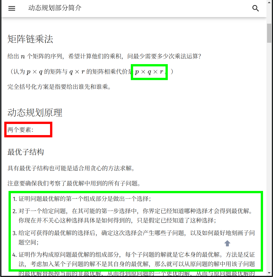 )。标题是简洁的词组,但我们不希望正文部分由词组拼凑而成。上图中「两个要素」,建议更改为「动态规划的原理具有以下两个要素」,上下文保持连贯。可取的地方是,适当使用 有序 列表可以更有条理地表述内容。再次提醒,在使用列表的时侯,每一项如果是一句话,需要在末位添加 标点符号。有序列表通常添加分号,在最后一项末位添加句号;无序列表统一添加句号。