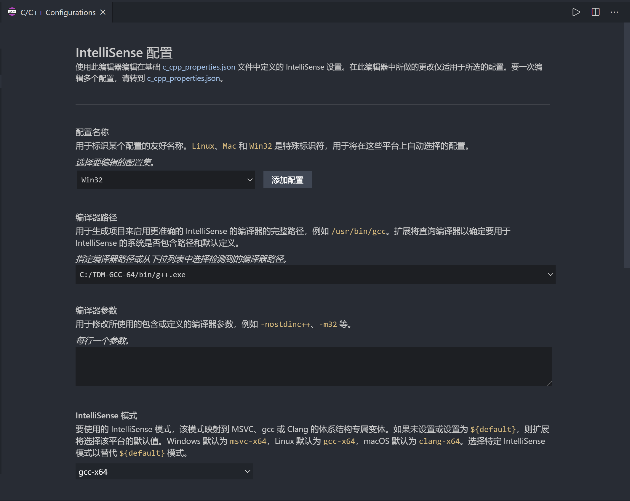 以使用自动补全等功能。否则会得到「IntelliSense 模式 msvc-x64 与编译器路径不兼容。」的错误。